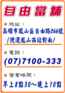 自由當鋪專業經營大寮區~當舖,汽車借錢,機車借款,黃金名錶借款,汽機車借款不限車齡不限車種,貸款的車輛也可辦理,高額借低利還,紓困無負擔,免去銀行煩人手續,以日計息輕鬆借,輕鬆還,多元融資管道,一通電話快速撥款。
